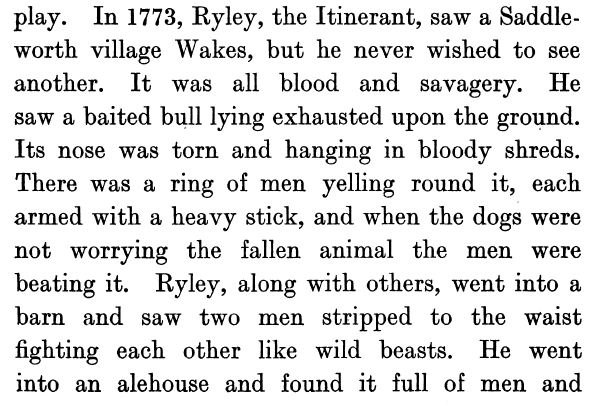 This includes the work of writers like Wrigley – Hughes recalls a Saddleworth landlord reciting verse after verse of Wrigley’s poetry from memory, misty-eyed paeans which Hughes gently criticises, not unreasonably, as “mechanical, didactic and sentimental”: “Home to old Saddleworth, home once more, / How my heart is stirred to its innermost core; / For I’ve been roaming and it’s a joy to go; / Up the hillside lane by the fields I know / Home to the hamlet where my own folks bide, / To the old armchair by the hearthstone side…” (and so on). Hughes is kinder about Wrigley’s prose, which paints a funnier, broader and more complex picture of Saddleworth’s people and history. Like Hughes, Wrigley is deeply nostalgic for and fascinated by histories of violence. Saddleworthians brawl, drink large quantities of ale, and mortify foreigners.